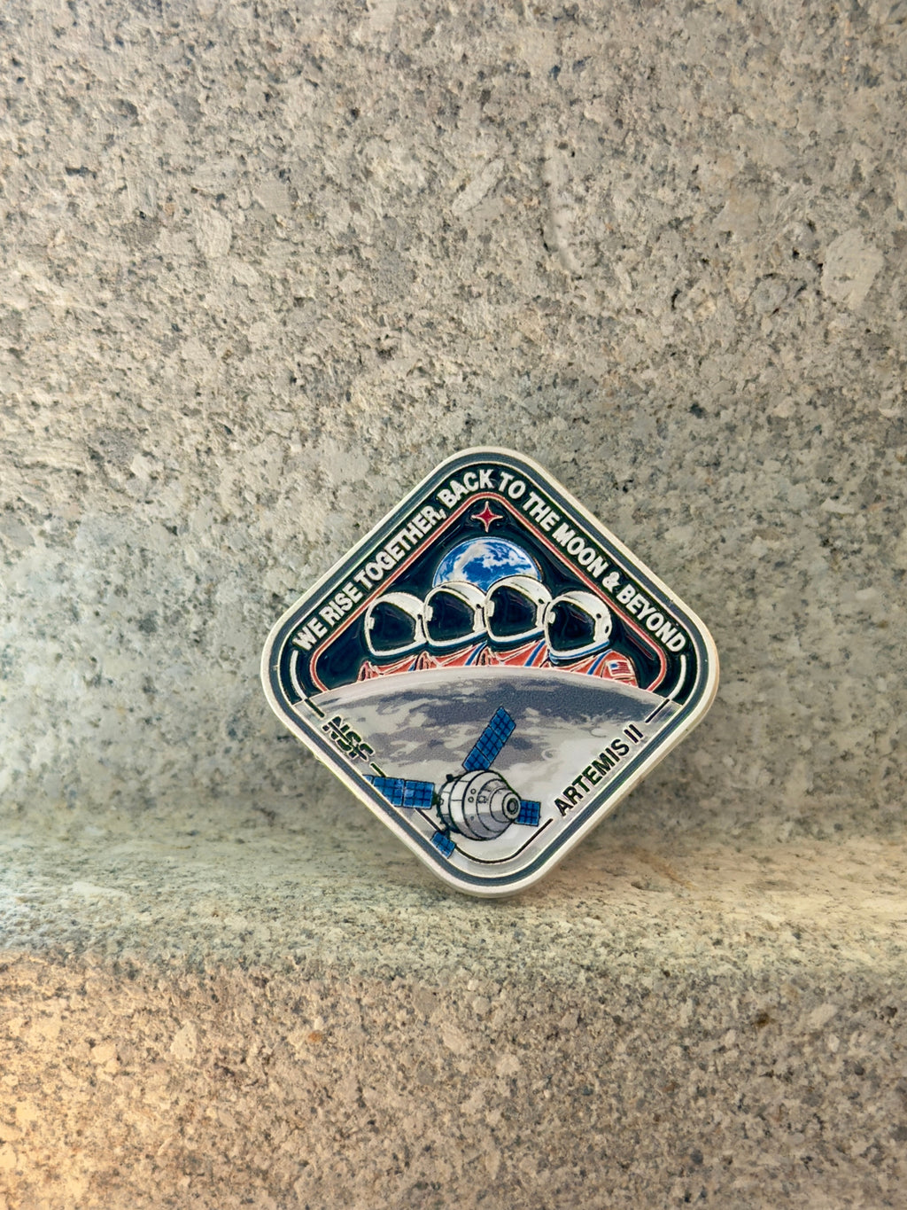 The phrase “We Rise Together, Back to the Moon & Beyond” anchors the patch, expressing the shared human effort behind Artemis II. It reflects international cooperation, technological progress, and a renewed commitment to exploration that extends beyond a single mission or generation.