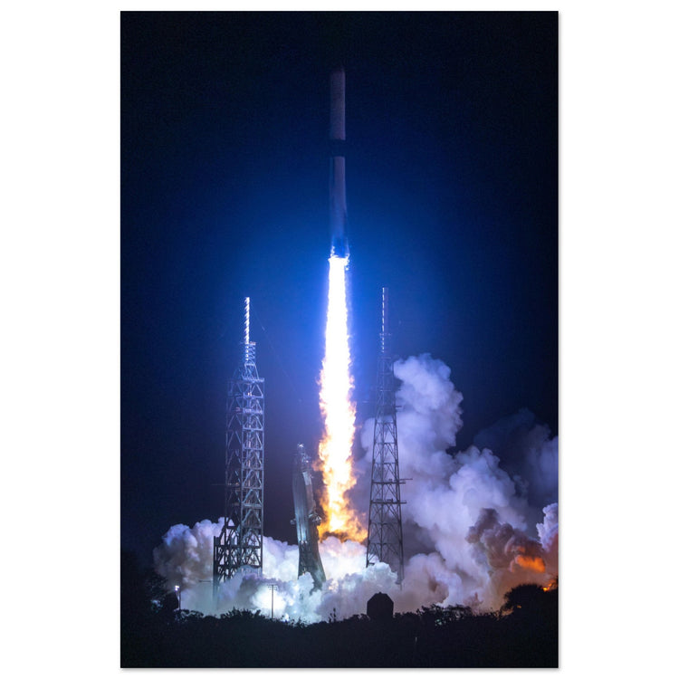 The maiden flight of Blue Origin’s New Glenn shines as it rises into the sky, powered by its BE-4 methalox engines. Their brilliant blue glow illuminates the night as New Glenn clears the pad at Cape Canaveral, Florida.