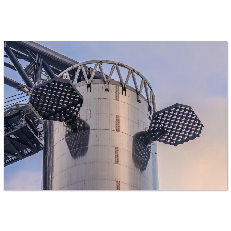 This print captures the upper interstage section of SpaceX’s Starship booster, showcasing the next-generation grid fins against the iconic stainless steel body. The image highlights the advanced aerodynamic control surfaces that guide the booster during atmospheric descent and landing.