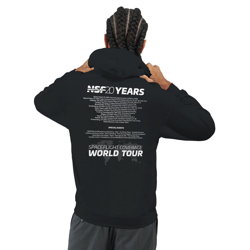 In celebration of 20 years of NSF, we’re taking you on a “World Tour” — featuring every spot we’ve visited or livestreamed from over the years. This unisex hoodie highlights our journey across the globe, and maybe even leaves a little room for autographs from the crew along the way!