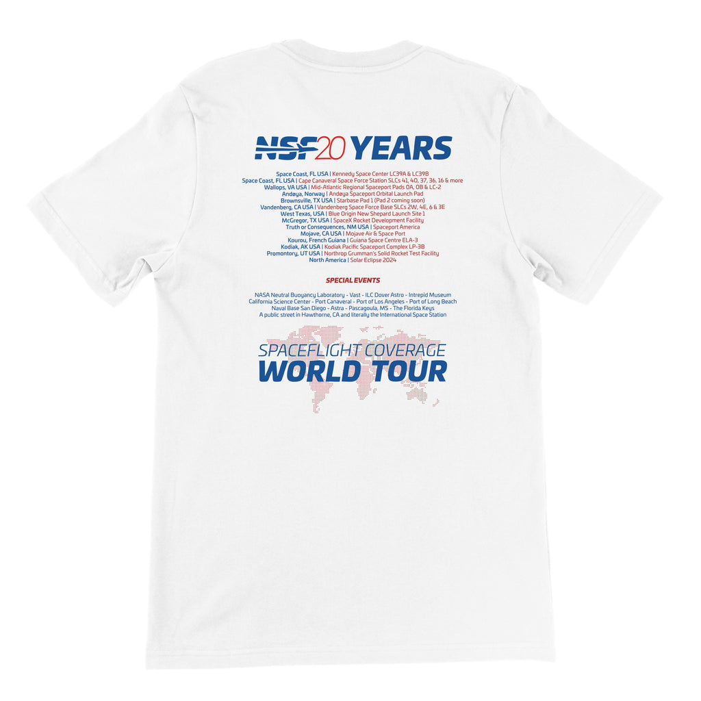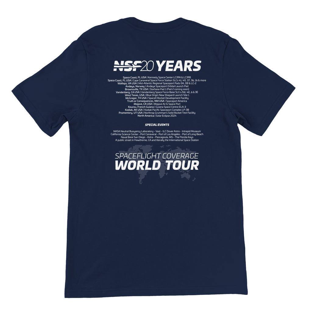 In celebration of 20 years of NSF, we’re taking you on a “World Tour” — featuring every spot we’ve visited or livestreamed from over the years. This Unisex t-shirt highlights our journey across the globe, and maybe even leaves a little room for autographs from the crew along the way!