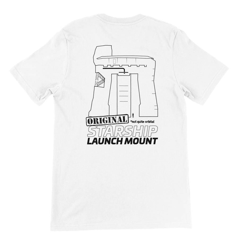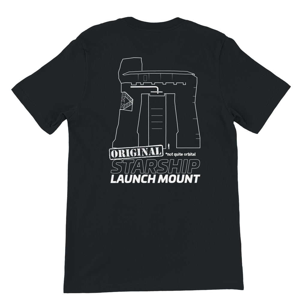 A gentle roast for the record books. The Original Launch Mount tee is a tribute to OLM-1 (Orbital Launch Mount 1), retired before ever sending Starship to orbit. Front: the NSF danger-van emblem. Back: bold “Original Launch Mount” graphic. Clean lines, easy wear, perfect for the fans to remember the first stand that held the dream.