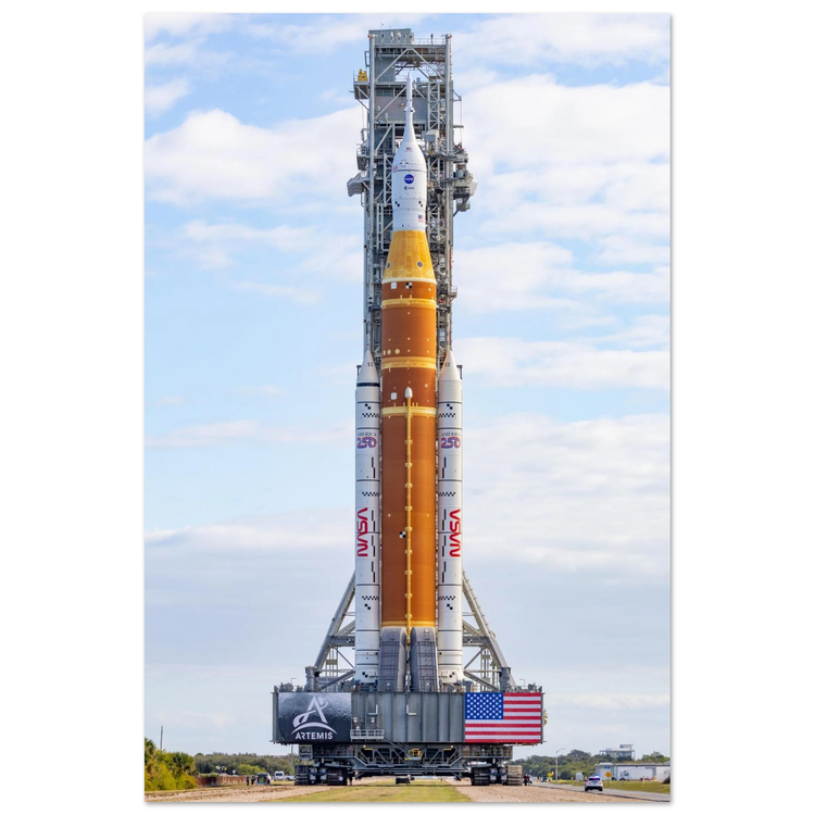 This powerful image captures NASA’s Space Launch System (SLS) and Orion spacecraft rolling to the launch pad at Kennedy Space Center, carried by the legendary Crawler Transporter 2 (CT-2). Traveling along the historic crawlerway at Cape Canaveral, Florida, this rollout marks a critical milestone in NASA’s Artemis program and the return of human spaceflight to the Moon. The SLS rocket, Orion crew capsule, and ground systems at Launch Complex 39B represent decades of engineering, exploration, and innovation at Kennedy Space Center. A must-see moment in modern NASA history, showcasing the path back to the Moon and beyond from Cape Canaveral.