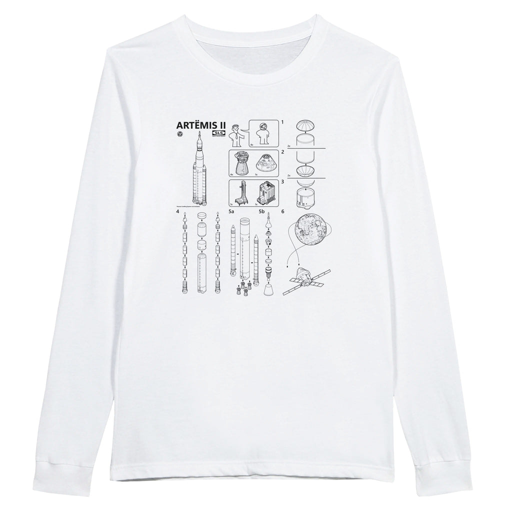 This clever design features a blueprint-style assembly diagram of NASA’s Artemis II mission, showcasing the Space Launch System (SLS) and Orion spacecraft like a set of IKEA instructions. From the SLS core stage and solid rocket boosters to the Orion crew capsule, this design celebrates the engineering behind NASA’s Artemis II lunar mission, the first crewed flight of the Artemis program on the path back to the Moon and beyond. Launching from Cape Canaveral, Florida, at Kennedy Space Center, this mission represents decades of innovation. No Allen wrench is included with these instructions.