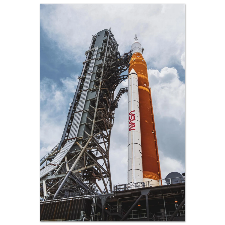 Taken during NASA’s Artemis I campaign, the Space Launch System (SLS) with the Orion spacecraft can be seen here atop Mobile Launcher-1 (ML-1) in all of its glory at Kennedy Space Center, set against the Cape Canaveral, Florida sunshine. This rare, up-close vantage point highlights the immense scale of not only the vehicle itself, but also its supporting infrastructure, including the mobile launcher platform and launch support tower housing SLS’s primary umbilicals. This launch marked a major step forward in NASA’s mission to return America to the Moon.