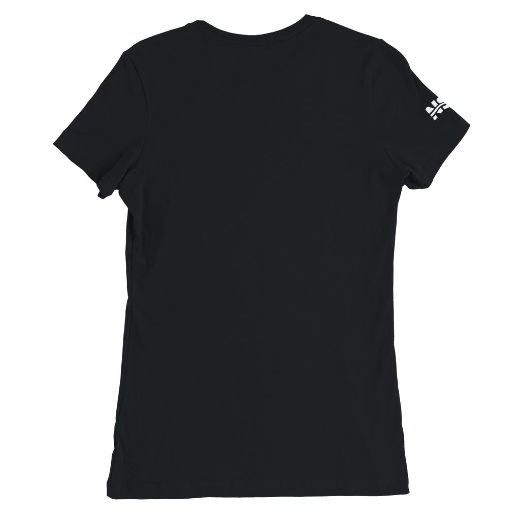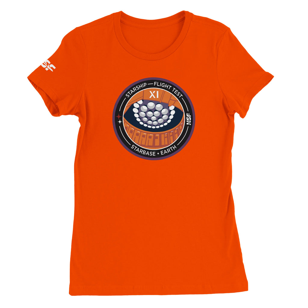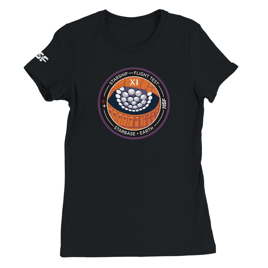 Women’s tee with Starship Flight 11 patch art. 100% combed & ringspun cotton.
